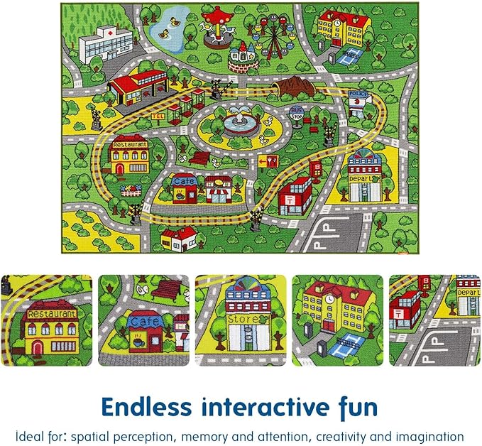 - Car rug play mat design is sure to spark curiosity and interest.The train rug collection features a lively cityscape with a hospital, restaurant, cafe, police station, houses, stores, and more, playroom rug providing a rich context for educational and engaging play.kids will delight in the vibrant colors and spend hours exploring different routes and buildings on car rug