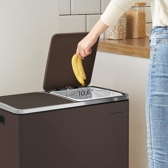 SONGMICS Trash Can, 2 x 8 Gallon (2 x 30 L) Garbage Can for Kitchen, with 15 Trash Bags, 2 Compartments, Plastic Inner Buckets and Hinged Lids, Airtight, Brown ULTB60BR