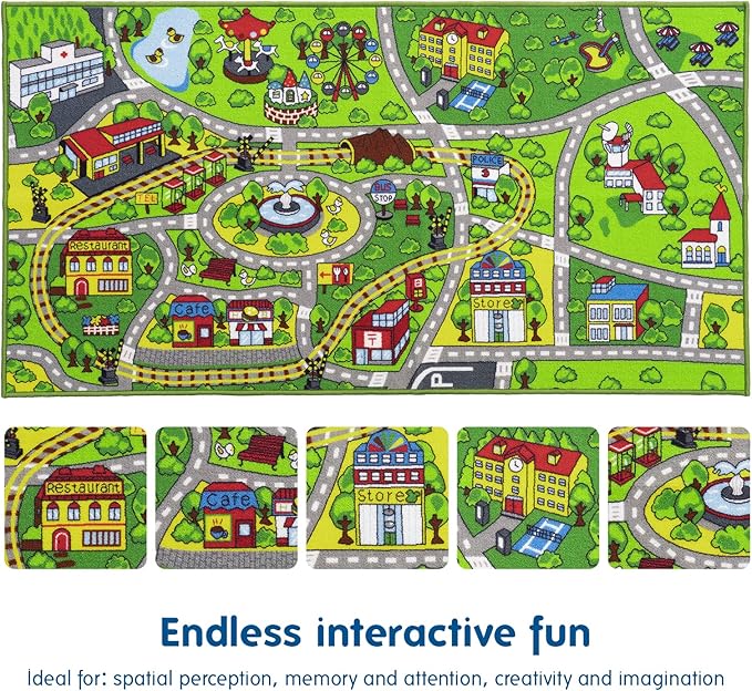 - Play Is The Best Way Of Learning: train rug play mat,motivate your child's curiosity and interest! the car track rug with city streets design with train,race track,store,bus stop,cafe,restaurant,tel etc....,makes it very versatile, provides a fun interactive backdrop for children to host many exciting games.through the pretend towns. your little one will enjoy playing on it,rolling cars,trucks and trains