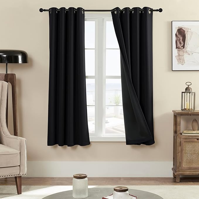 100% Blackout 340 GSM Curtain Panels , Heat and Full light Blocking Drapes with Grommets for Bedroom, Black Thermal Insulated Window Treatment Drapes for Living Room (Black, 2 Panels, 52 x 63 inch)