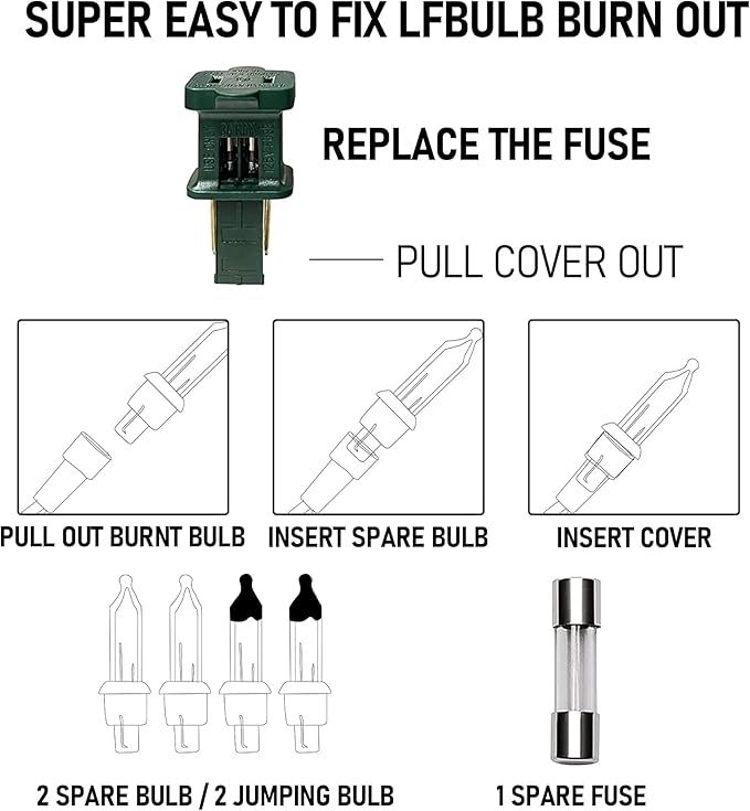 - High Quality: The Christmas tree lights is IP 44 waterproof, build-in 3A fuse and pass with UL certified, is safety for both indoor and outdoor decorations. Each bulb works individual, others will work well when one bulb is defective. Just use the spare bulbs to replace the defective bulb.