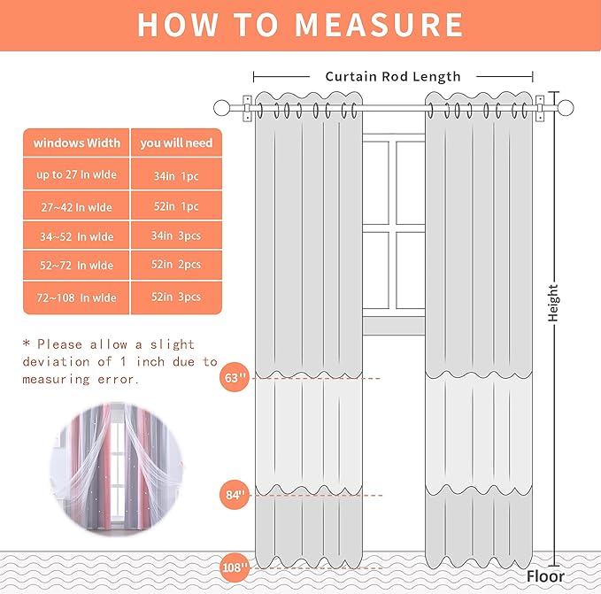 - PACKAGE INCLUDES: Each package contains 1 panel accompanied by 1 tie and 3 bows. The panel features a dual-layer design, comprising a sheer curtain and a printed blackout curtain adorned with laser-cut stars. With 8 grommets on top, each panel is designed to effortlessly fit most standard rods.