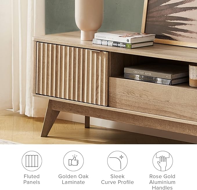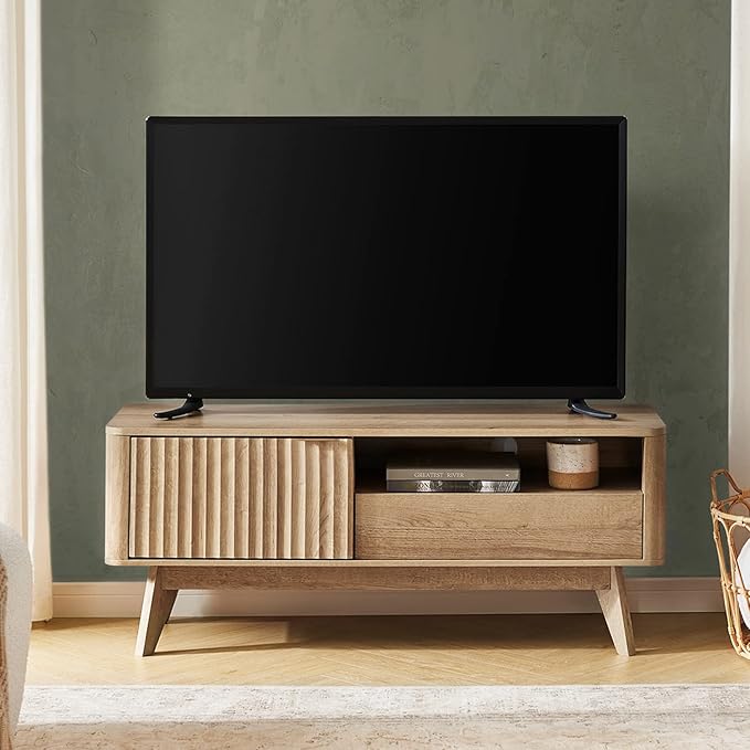 mopio Brooklyn Mid-Century Modern TV Stand, for TVs up to 50” / 59" Waveform Panel, Sleek Curved Profile with Adjustable Shelf and Sturdy Box Frame Leg (Golden Oak, 47")
