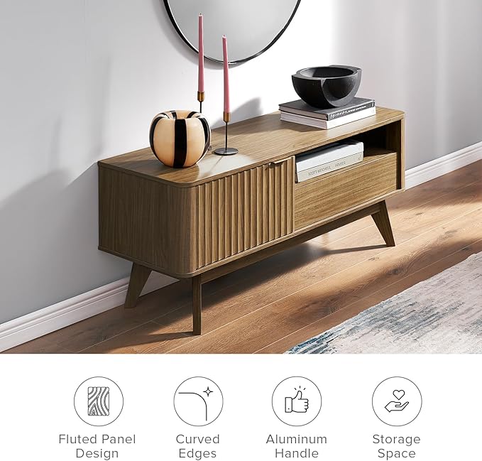 mopio Brooklyn Mid-Century Modern TV Stand, for TVs up to 50” / 59" Waveform Panel, Sleek Curved Profile with Adjustable Shelf and Sturdy Box Frame Leg (Natural Walnut, 47")