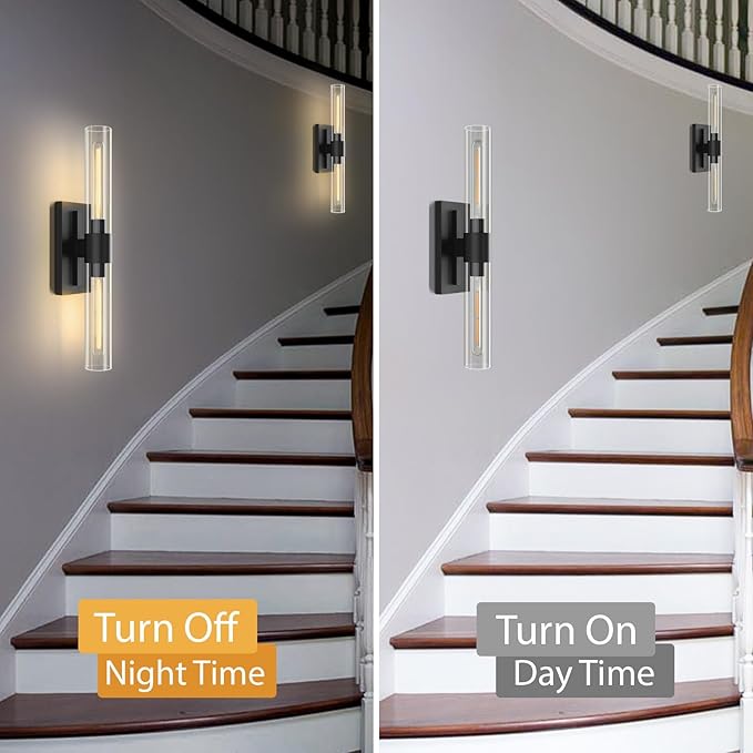 - 【Premium Materials】: The base of this black wall sconce set of two with clear glass shade is all made of high quality copper, which doesn't shed paint and is not easy to rust and fade. The lampshade is made of thickened high clear hard glass shade, durable and unbreakable. Each shade is 10 inches long and 2.5 inches in diameter for a brighter, even and softer light.
