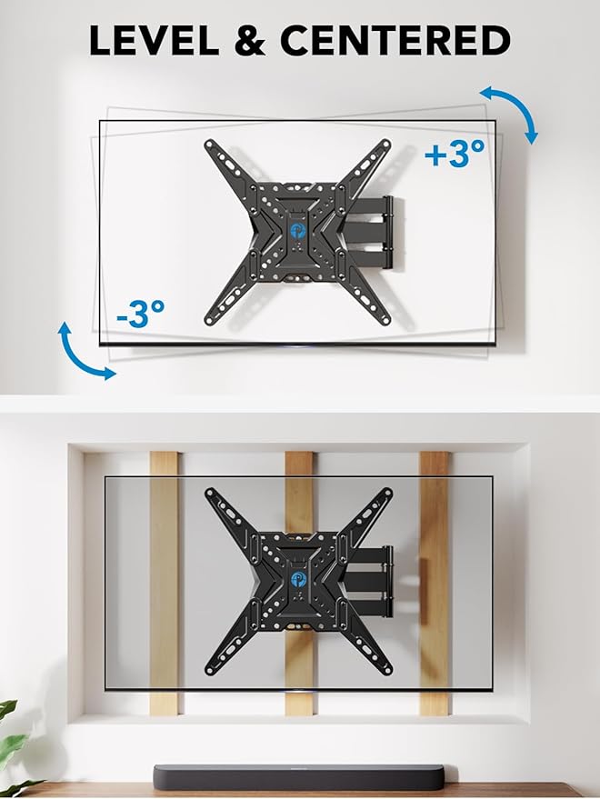 - Simple to Install: The TV wall bracket includes step-by-step instructions and standard mounting hardware for easy installation on single wood stud, concrete, or brick walls. The +/-3° leveling adjustment allows you to fine-tune your TV’s position after installation.