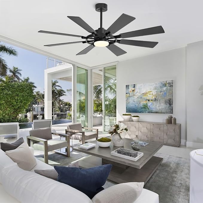 - LARGE CONTEMPORARY CEILING FAN: A contemporary design with a farmhouse touch. This 60-in ceiling fan featuring a striking windmill silhouette with 8 black finish blades, which bring a rustic farmhouse look into your space.