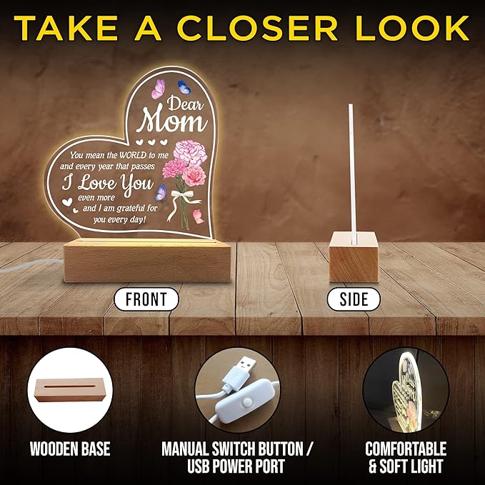 - Ideal For Any Occasion - This night light is not only ideal for Mother's Day, but also for other occasions such as birthdays, anniversaries, Valentine's Day, Christmas, and holidays whether she's your stepmother, mother-in-law, grandmother, boyfriend's mom, or soon-to-be mom. It's a gift that she will cherish forever and that will make you proud to give it to her.