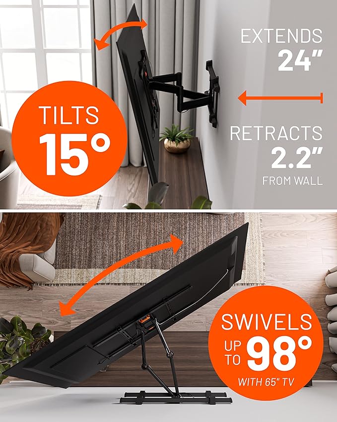 - Motion so smooth you won't believe it's not butter! Our full motion mount offers a whopping 24" of smooth extension, along with tilt & swivel capabilities, ensuring you'll always have the best seat in the house.