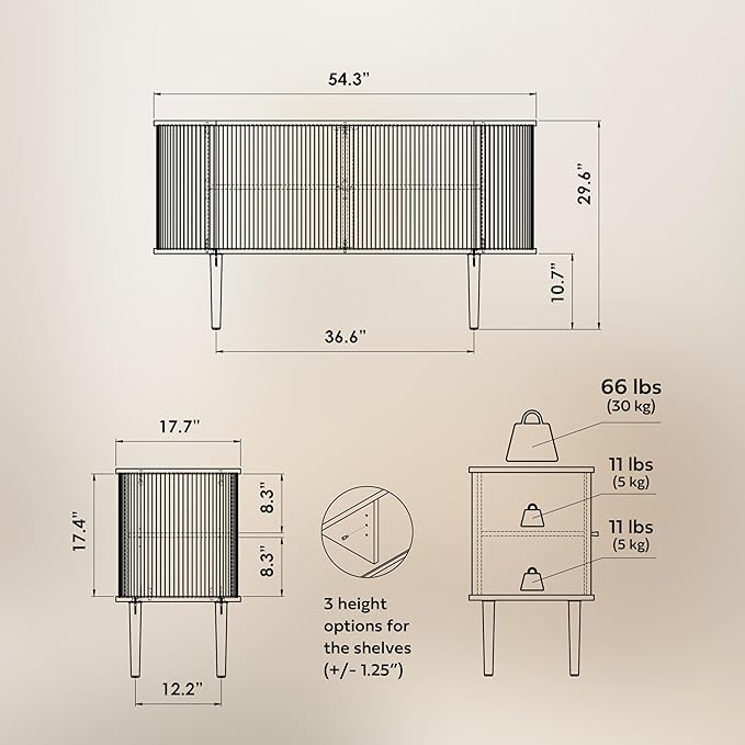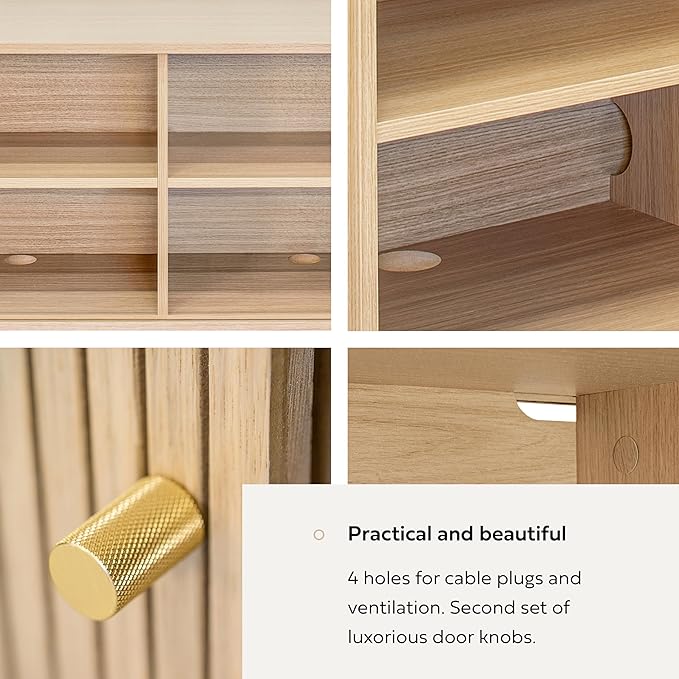 - ENJOY EFFORTLESS STORAGE as you can choose between 3 set heights for the adjustable shelf to maximize the use of the six storage spaces hidden behind the sliding doors. Fluted oak dining room buffet cabinet (width 54.3 ‘’ x height 29.5’’ x depth 17.7’’) offers easy access to most frequently used tableware and serving utensils.