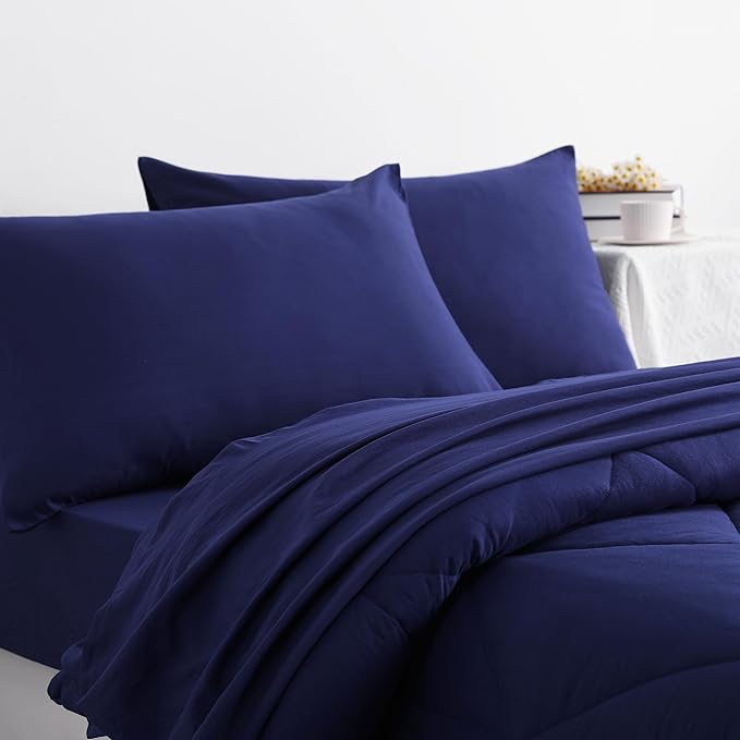 NTBAY Twin Comforter Set with Sheets, 5 Pieces Soft and Breathable Bedding Set, Bed in a Bag, Down Alternative Comforter Set Solid Color All Season, Kids Bedding Set, Navy Blue