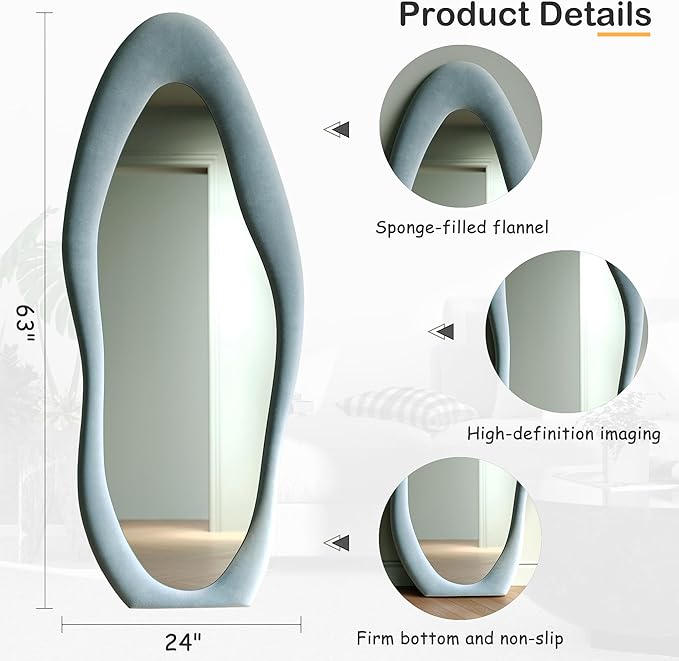 Honyee Full Length Mirror, 63" x 24" Wall Mirror, Flannel Wrapped Wooden Frame Full Body Mirror, Irregular Wavy Mirror Hanging or Leaning Against Wall for Cloakroom/Bedroom/Living Room, Blue