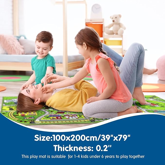 - Dimensions: car play mat with a size of 79x39inches/3.3x6.6ft,quite perfect for 1-4 kids,vivid colors,multiple road design,perfect size and can provide more adequate playing space for kids. and great children's activity rugs for playing make believe with trucks,cars and trains