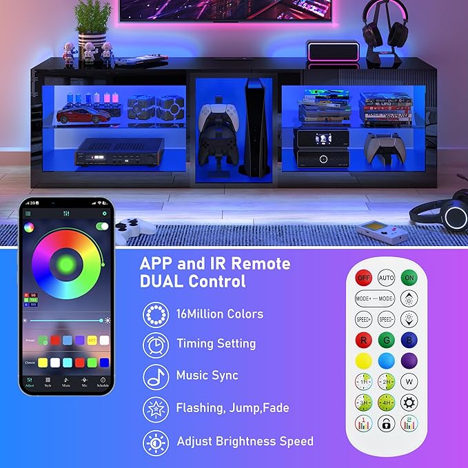 - Adjustable over 60,000-color LED TV Stand : LED tv stand has 20 colors and 22 lighting models that can be wirelessly controlled by the 44 key RGB remote control. The APP can control over 60,000 colors,The color's atmosphere can fluctuate with the sound, and the timing can be set. The entertainment center's LED TV cabinet is equipped with a variety of flashing modes, providing an excellent immersive experience for watching videos and games. Can be used for birthday, party, or other special day.