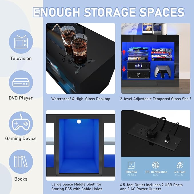 - High Gloss Design:LED gaming entertainment center made of High Gloss P2 grade particle board, scratch-resistant and waterproof, easy to maintain. The High Gloss desktop is flat and smooth with no gaps. Led TV stands desktops have 6.5-foot Power Outlets Including 2 USB and 2 three-hole sockets, enabling you to use your gaming device and TV more effectively. Modern high-gloss and minimalist structures also provide great stability and fashion
