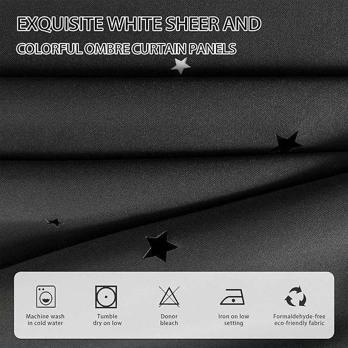 - PACKAGE INCLUDES: Each package contains 1 panel accompanied by 1 tie. The panel features a dual-layer design, comprising a sheer curtain and a printed blackout curtain adorned with laser-cut stars. With 6 grommets on top, each panel is designed to effortlessly fit most standard rods.