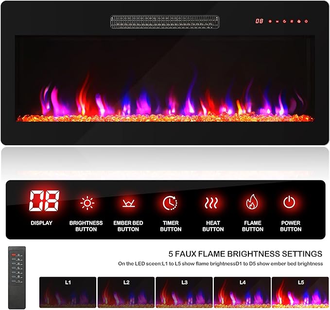 - [Advanced Fireplace Function] This TV entertainment center is equipped with an electric fireplace feature offering 16-color flame, 5 brightness modes, 5 speed modes, touch screen buttons, 1-9 hours timer, adjustable temperature (64-82℉), and remote control for a cozy, customizable ambience.