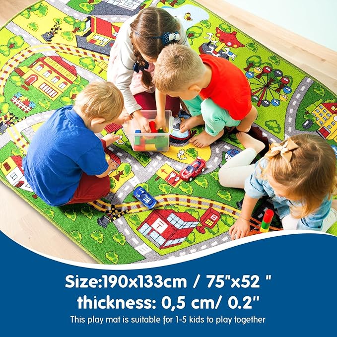 - Play Is The Best Way Of Learning: Motivate your child's curiosity and interest! The kids interactive rugs car with a vibrant and imaginative city town scene design,featuring elements like a train, race track, store, bus stop, cafe,restaurant,and tele etc., and provides a fun interactive backdrop for children to host many exciting games. This city town setup allows your little one to enjoy playing with various vehicles such as cars,trucks,and trains