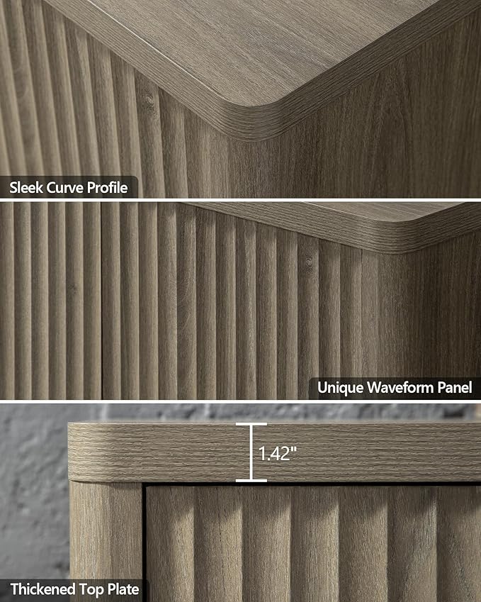 - 【Minimalist & Practical】- The storage cabinet boasts a minimalist curve profile and doors with a unique waveform panel, setting it apart from ordinary furniture pieces. Equipped with pop-up design doors that offer easy access to stored items while maintaining a sleek and seamless appearance. This distinctive design adds a touch of sophistication and style to your living space, enhancing the overall aesthetic appeal of your home decor.