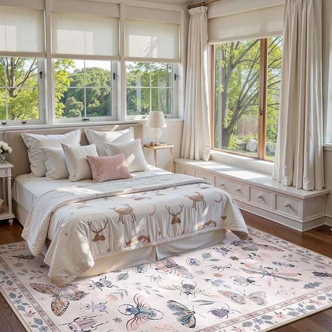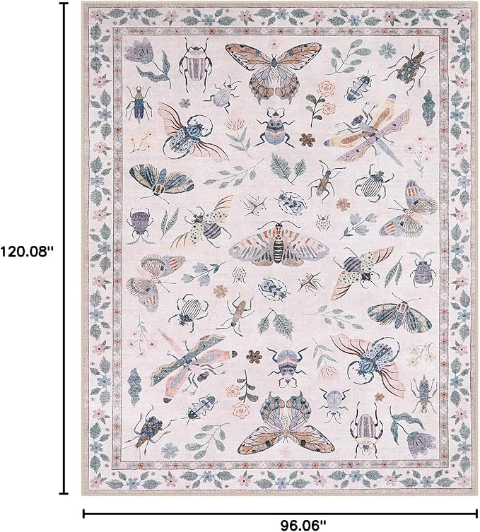 Lahome Insect Print Washable Rugs 8x10, Soft 8x10 Rugs for Living Room Dining Room Ultra-Thin, Non-Slip Modern Bedroom Rug Large Carpet Non-Shedding Accent Rug for Office Classroom(8x10ft,Pink)