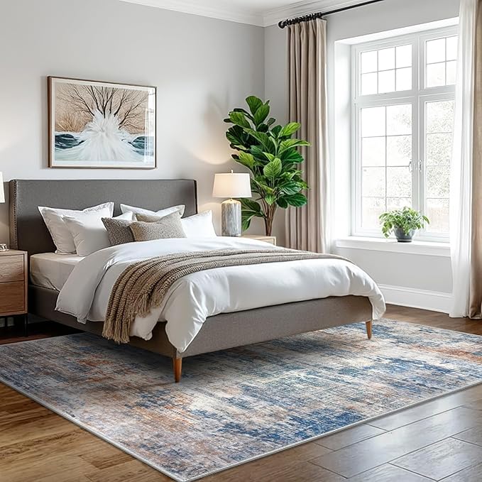 IOHOUZE Abstract Area Rugs 5x7 Ft Washable Rugs for Living Room, Non Slip Dining Room Rug, Printed Faux Wool Rugs for Bedroom, Floor Carpet for Office Nursery Playroom, Blue Rust