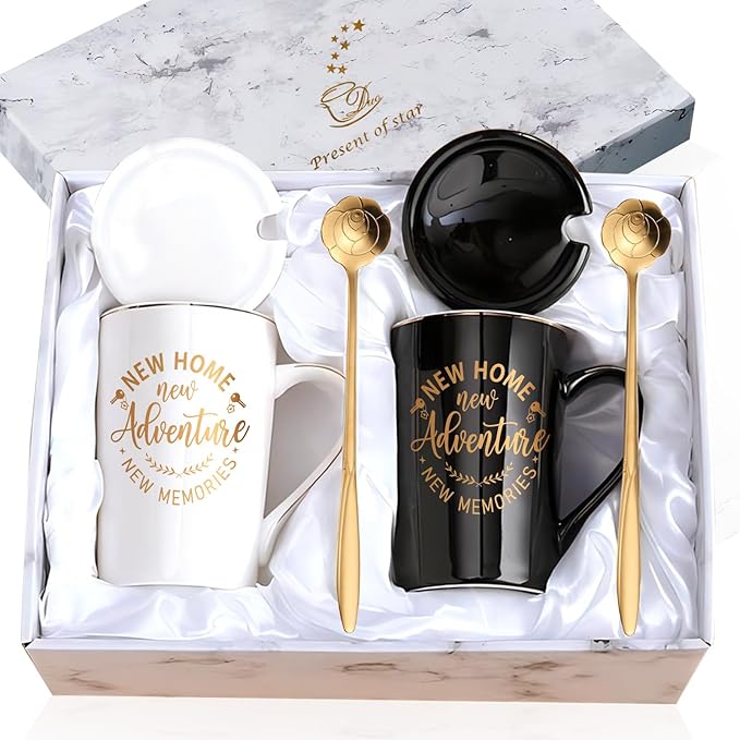 - Exquisite Gifts Box for House warming: Presented in a beautifully designed gifts box, these housewarming gifts require no additional wrapping. The set includes 2pcs ceramic black&white mugs, 2pcs cup lids, and 2pcs golden spoons. This new house gifts for new home owners is sure to be cherished, making their mornings memorable