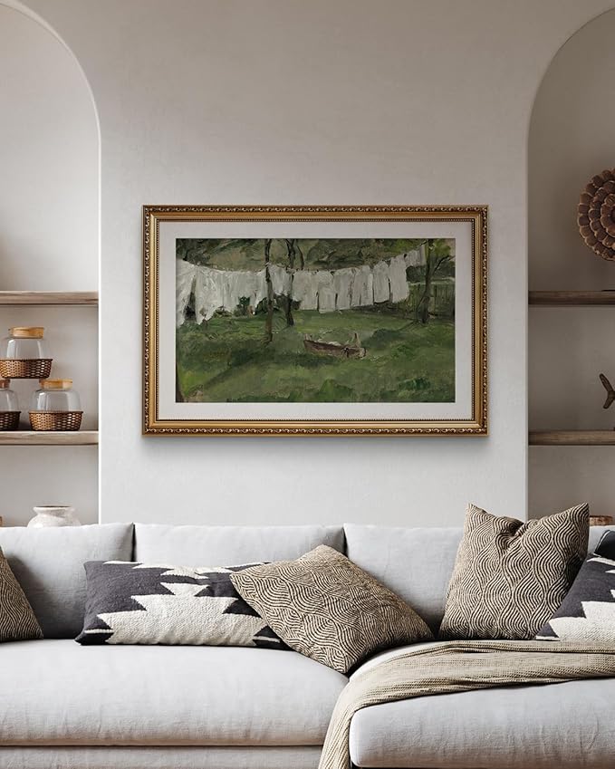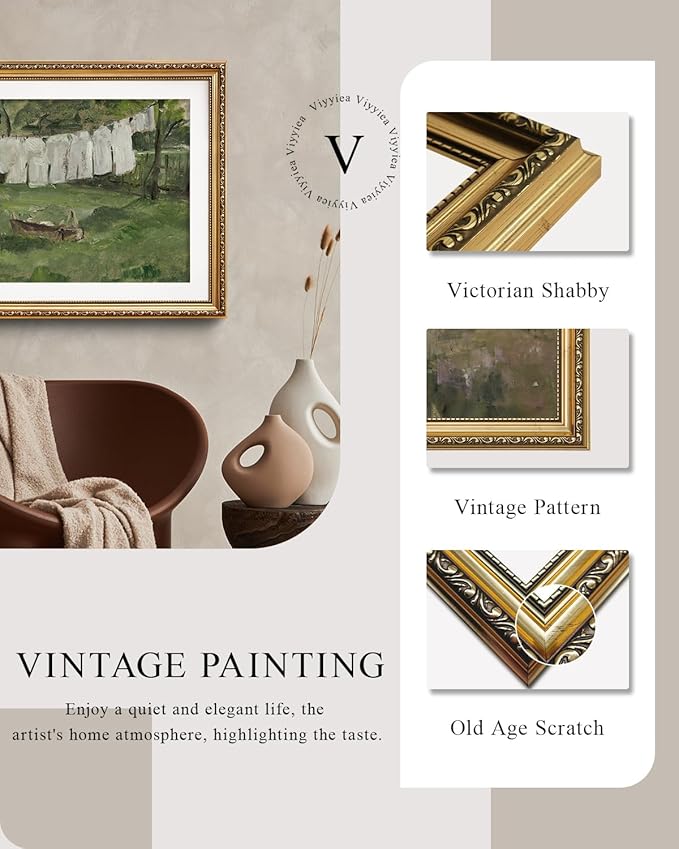 VIYYIEA Gold Framed Wall Art Canvas Print Home Decor Vintage Laundry Room Art Print Antique Oil Painting Country Landscape Retro Wall Decor Canvas Prints for Living Room Bedroom Office Gallery 24x36in