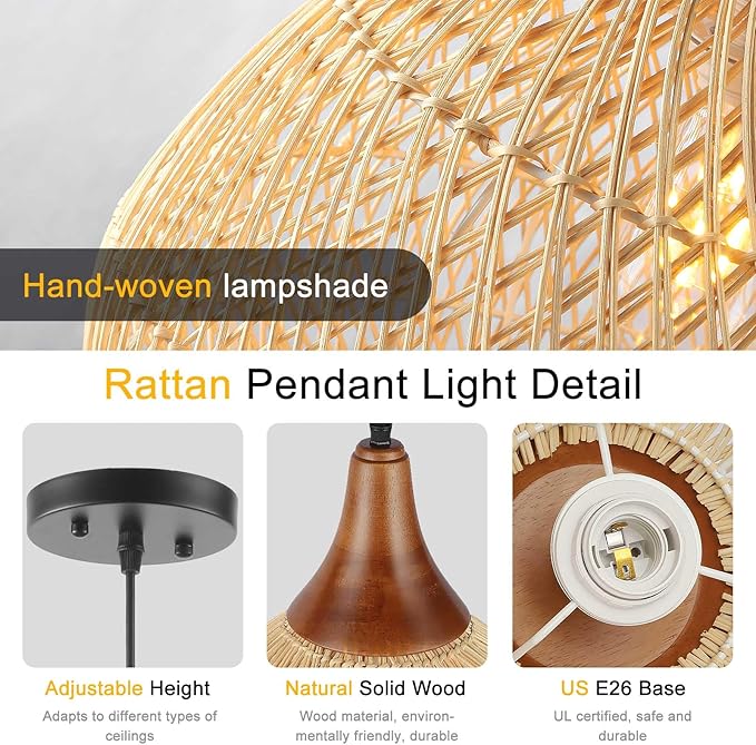 - Bulb Requirements & Dimmable - This natural wicker chandelier use standard E26 lamp base, Max 60W. This pendant light fixture is compatible with all kinds of E26 bulbs. It can be dimmed when using dimmable bulbs and dimmable switches (Bulb and Switch Not Included).
