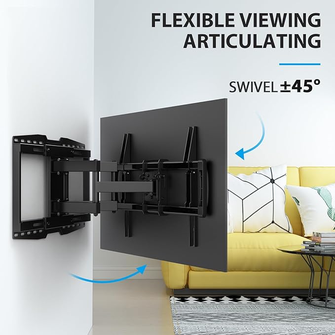 - 【ADJUSTABLE VIEWING ANGLE】: Sliding design full motion tv mount can shift horizontally left or right 8” for perfect placement, it with +5°/-15° tilt to reduce glare; Swivel tv mount with +/- 45°swing; Level adjusts +/- 3° for maximum viewing flexibility
