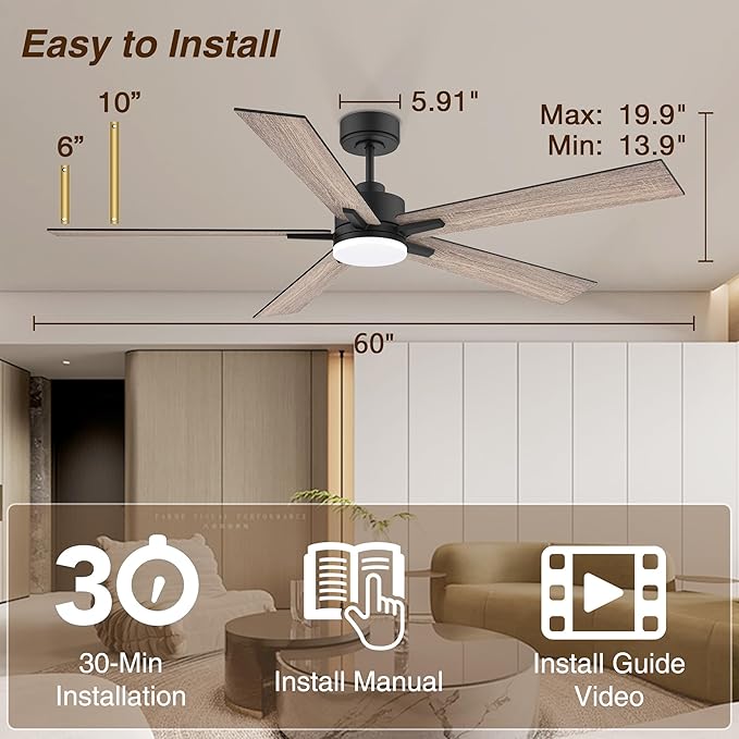 - 【Timer,6 Speeds,Quiet DC Motor】6-speeds modern ceiling fans with lights delivers airflow up to 5075 CFM. Reversible dc ceiling fan with light keeps the room warm in winter and cool in summer with noise under 35dB, no hum and no wobble, making it suitable for quiet environment such as bedroom and theater room. Easily switch the fan's direction on the remote. Smart lighting & ceiling fans with auto-on/off timer help schedule any time you need
