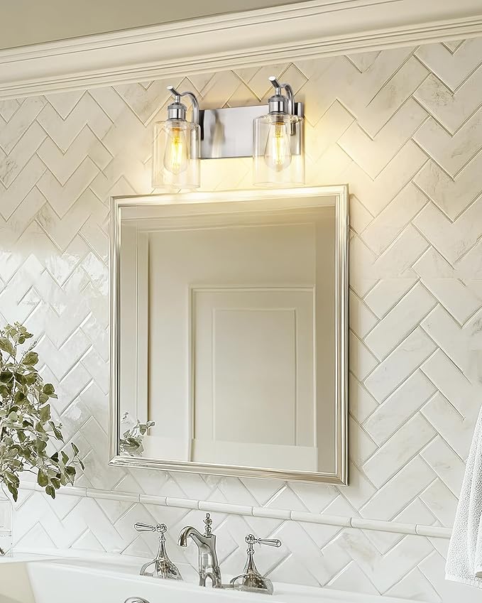 - Classic and Simple Design: This 2-light wall lights is a welcome addition to any main bathroom or powder room that could use some extra lighting. It's crafted from metal, and it features a rectangular tapered backplate with brushed nickel finish. Two clear glass shades with cylinder are held by gooseneck arms and backplate for a traditional look.