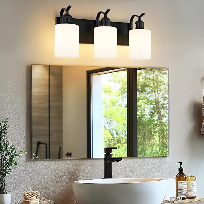 Black Vanity Light, 3-Light Bathroom Light Fixture, Modern Wall Sconce with Milk Glass, VL01BKW-3