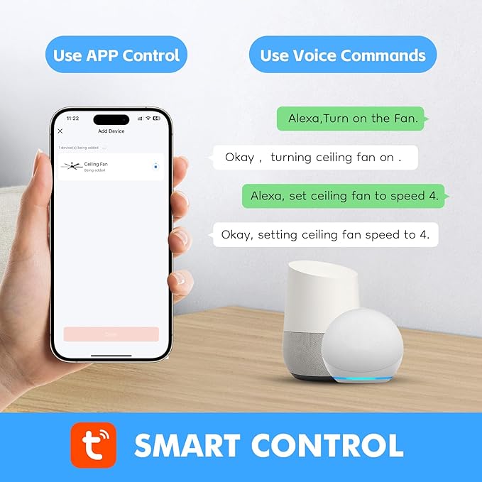 - 【SMART VOICE/APP/REMOTE CONTROL】The modern smart ceiling fan is fully integrated with Alexa, Google Assistant, and Tuya app for seamless smart control. The handheld remote can also be mounted on the wall as a switch. Even without WiFi, you can control this black outdoor ceiling fan with the remote. Voice commands like "Alexa, turn off the living room fan" make it easy to manage your fan with minimal effort
