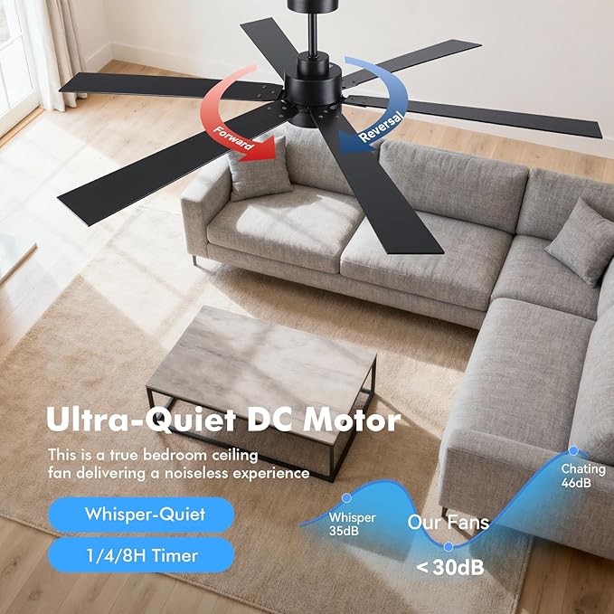 - 【SUPER QUIET EXPERIENCE】Enjoy the breeze without the noise! Unlike traditional noisy ceiling fans, our upgraded pure copper DC Motor ceiling fan that runs smoothly with a volume as low as 30dB. This 6-blade ceiling fan blends performance and efficiency, making it a top choice for a relaxing living rooms, offices or any indoor/commercial can be intelligently set (1/4/8 hours) to sleep automatically off, especially in bedrooms for light sleepers