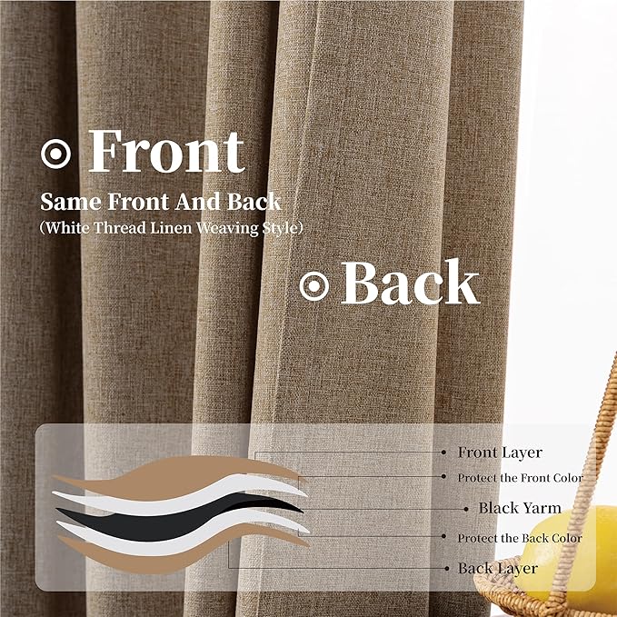 - 100% BLACKOUT TEXTURE: Our blackout curtains are made of linen blend fabric with the same linen style fabric on the front and back with a black center. Allowing the curtains to display a natural, stylish texture both from the inside and outside. The white color is thicker on the fabric since it is the lightest color in order to achieve 100% full blackout in all colors. Our curtains drape well, not only with a natural touch, but also bring a cozy velvet feeling and look elegant and simple.