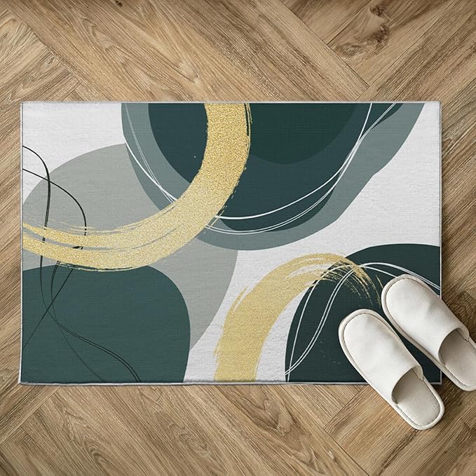Bathroom Rug 3x5 Entryway Geometric Green Gold Circles Mat Modern Abstract Area Rug Machine Washable Soft Rug Semicircle Carpet for Entrance Beside Living Room Bedroom Kitchen Office Indoor
