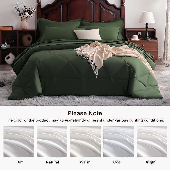 NTBAY Queen Comforter Set with Sheets, 7 Pieces Soft and Breathable Queen Bedding Set, Bed in a Bag, Down Alternative Comforter Set Solid Color All Season, Queen Bedding Set, Olive Green