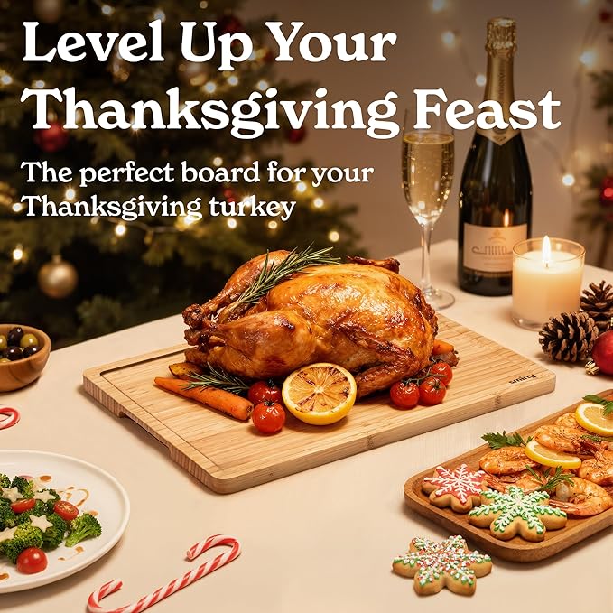 - Practical Design: Features deep juice grooves to trap liquids. The reversible design extends the meat cutting board's life. Includes a holder for space-saving storage that promotes airflow and fast drying