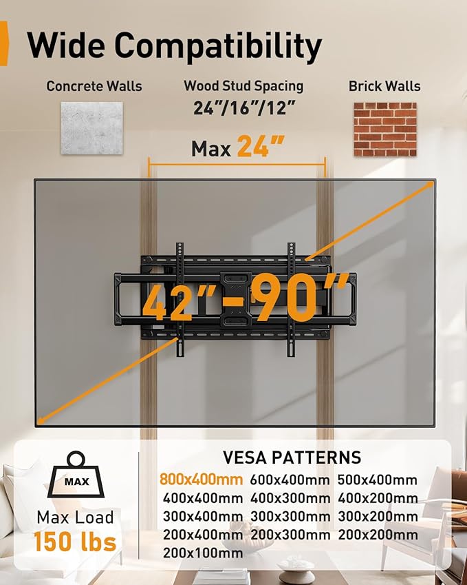 - Wide Compatibility: This full motion TV mount is compatible with most flat or curved 42″–90″ TVs with VESA patterns ranging from 200 x 100mm to 800 x 400mm. The 85 TV wall mount bracket can be installed on 8″/12″/16″/24″ wood studs, concrete, or brick walls. Please note that it should not be installed on drywall alone. The wall plate width is 14.6 inches, and the length is 28.07 inches. Verify the wall plate will fit your desired location.