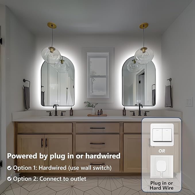 - 【3 COLOR TEMPERATURE】 This Arch Backlit Bathroom Mirror ranges from 3000K - 6000K offers you choices of different light colors for different purposes. Warm (3000K) cozy softer light is suitable for night skincare, Natural (4000K) same as daylight is suitable for morning makeup and Cold (6000K) super bright light is suitable for reflection of specific detail.