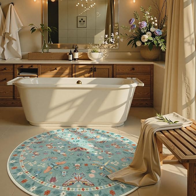 Lahome Insect Washable Round Rugs, Non-Slip Soft Round Rug 4ft Ultra-Thin, Small Boho Circle Carpet for Entryway Kitchen Bedroom Nursery Bathroom, Green