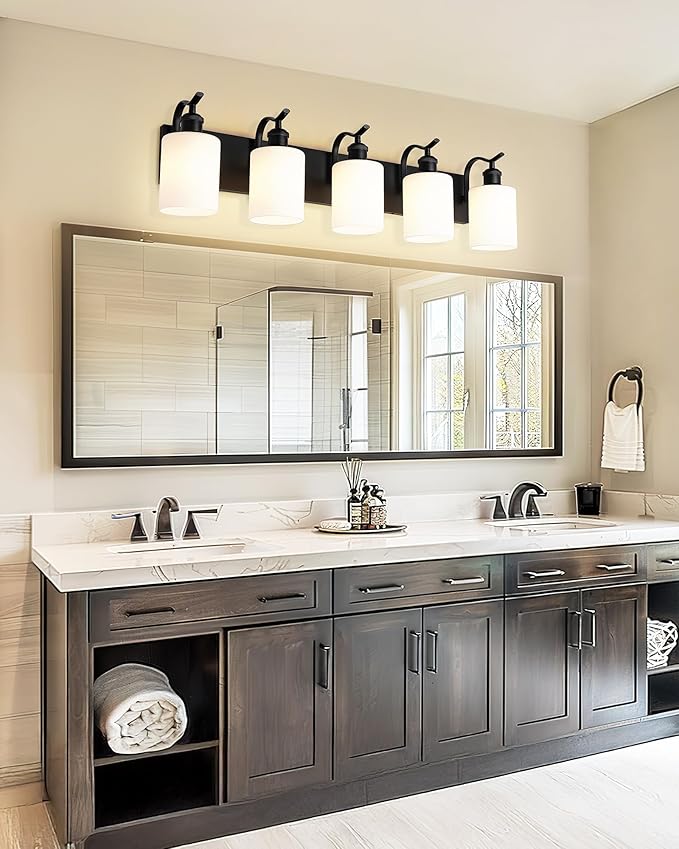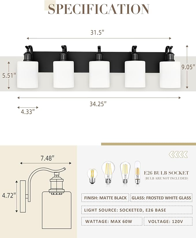 - Suggested Bulb Requirements: This black vanity lights for bathroom requires 5 x E26 A19/ST58/ST64 LED Edison bulbs (maximum 60W each; bulbs not included). When paired with dimmable bulbs and a compatible dimmer switch, you can easily customize the lighting to create your desired ambiance.