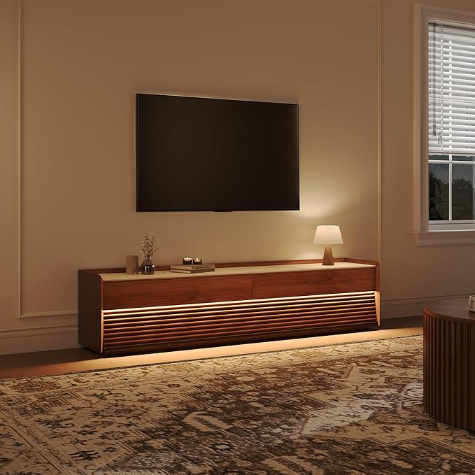 - Integrated LED Lighting: Enjoy the convenience of built-in LED lighting. The warm, 6-level adjustable lighting with remote control enhances the visual appeal of your TV console and makes your displayed items stand out