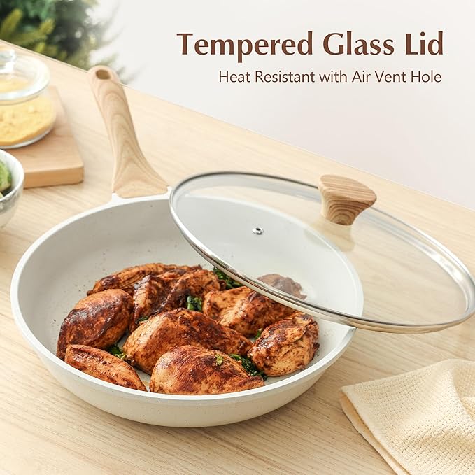 - INDUCTION COMPATIBLE - The nonstick frying pan with lid is made of heavy-duty cast aluminum to prevent it from warping and wobbling. Its induction base is suitable for all stovetops, including induction cooktop, and it heats fast and evenly.