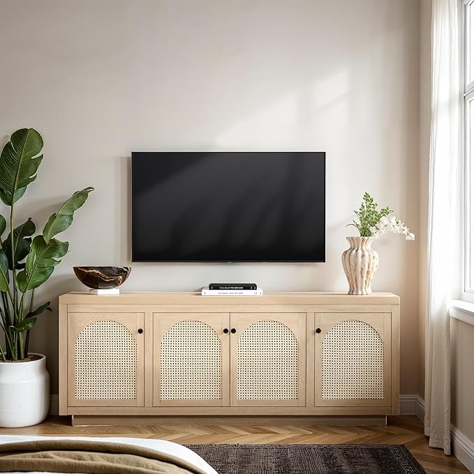 - ADD NATURAL TEXTURE: Woven rattan doors and arched panels bring organic warmth with a sleek, modern touch.