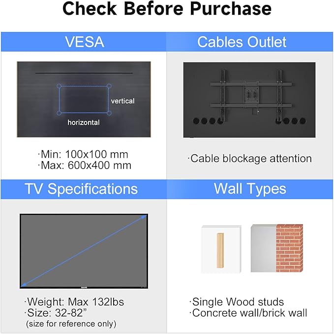 - Universal Compatibility – This full motion TV mount fits most 32-85 inch flat, curved, LED, LCD, OLED & QLED TVs with VESA 100x100mm to 600x400mm and supports up to 132 lbs (60kg). Always verify your TV's size, weight, and VESA compatibility before purchase.