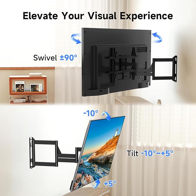 - Full Motion Adjustability – Features ±90° smooth swivel, +5°/-10° tilt, and ±3° leveling for the perfect viewing angle. Easily adjust your TV without moving the entire mount.
