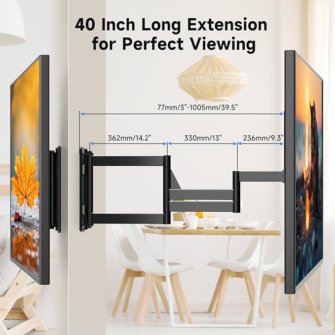 - 40" Long Extension Arm for Maximum Flexibility – Extends 40 inches for optimal viewing angles and retracts to just 3 inches for a space-saving, sleek look. The triple folding arm design allows smooth adjustments from room to room.