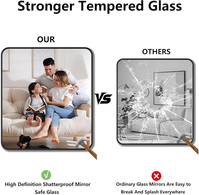 - Safe & Secure Tempered Glass: Built with shatterproof tempered glass and rust-resistant aluminum frame, this wall mirror for bathroom mounts securely above sinks. Steam-proof design withstands daily showers and heavy use—zero cracks, rust, or warping. Sleek, reliable, and perfect for high-traffic bathrooms: clear reflections, durable protection.