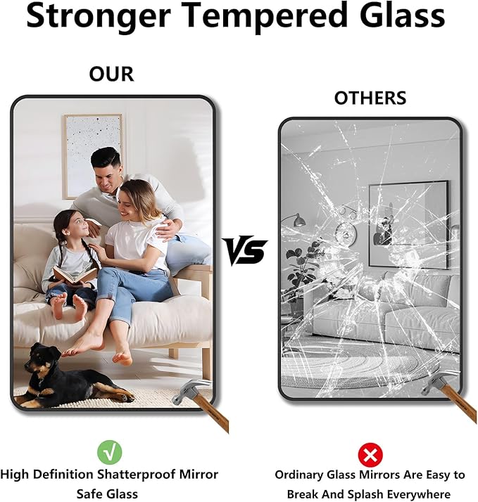 - Safe & Secure Tempered Glass: Built with shatterproof tempered glass and rust-resistant aluminum frame, this wall mirror for bathroom mounts securely above sinks. Steam-proof design withstands daily showers and heavy use—zero cracks, rust, or warping. Sleek, reliable, and perfect for high-traffic bathrooms: clear reflections, durable protection.